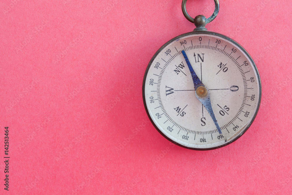 Vintage compass retro style travel instrument used for navigation orientation geographic cardinal directions north, south, east, and west. Pink paper textured background, copy space photo