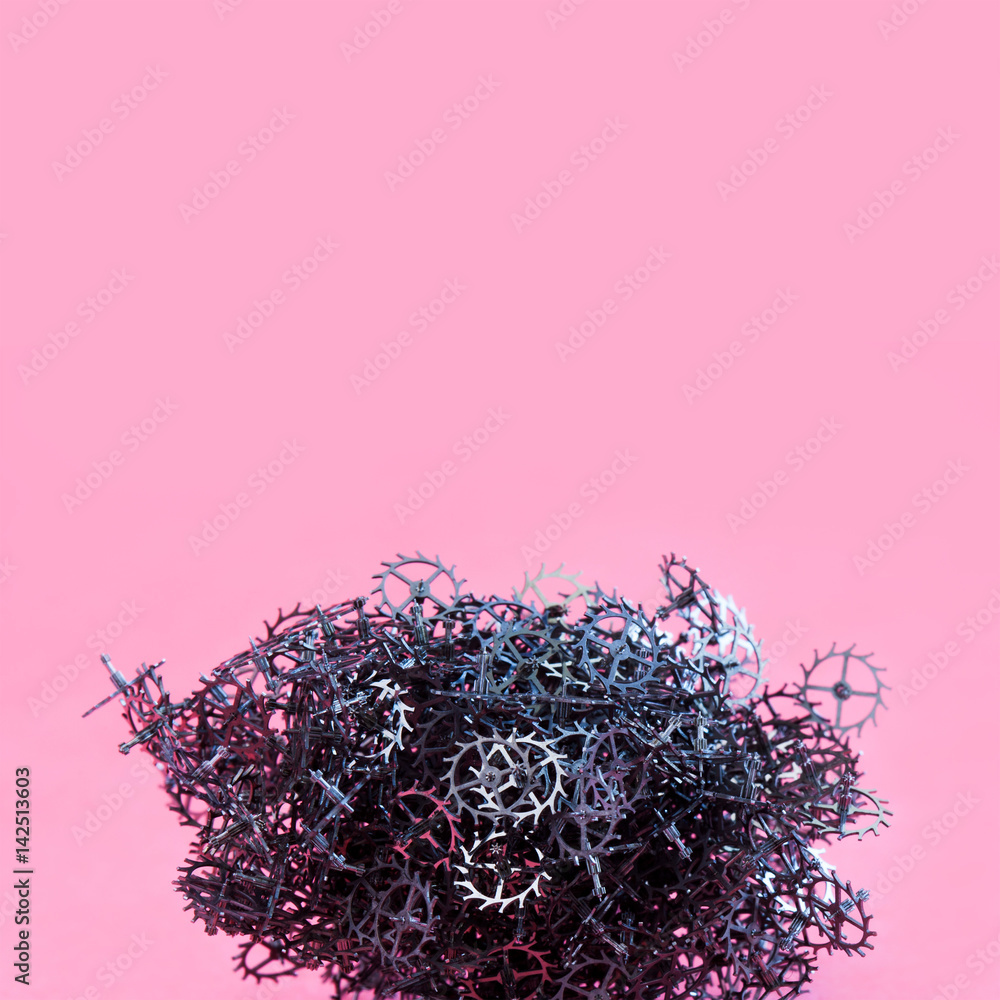 Abstract technology concept. Thousand cog gears on pink background macro view photo. Pile of black metallic clock watch equipment parts close-up, shallow depth of field. Selective focus