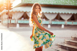 Happy beautiful young woman smiling in the street at sunny summer day.