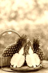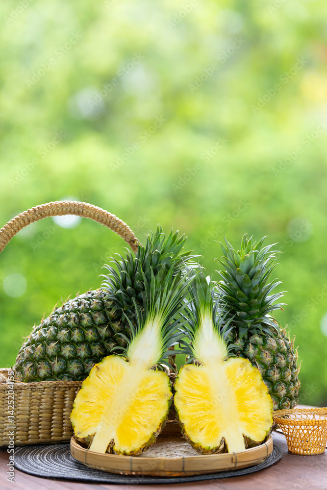 Pineapple fruit in Bamboo basket on wooden table in garden, Organic Taiwan Watermelon Pineapple with slices on blurred greenery background.