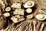 Healthy green food. Vegan sandwiches with avocado and vegetables on wooden background.