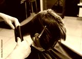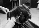 Male hairdresser is preparing for haircut of Beautiful woman in the beauty salon. He straightens hair.