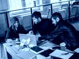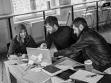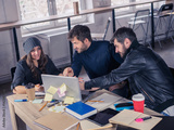 Young smart team. Group of modern people discussing project on meeting in the office. Working environment with laptop, coffee, notepads and stationery.