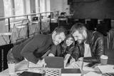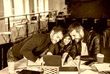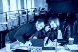Smiling team. Group of modern people watching project on tablet in the office and laughing. Working environment with laptop, coffee, notepads and stationery.