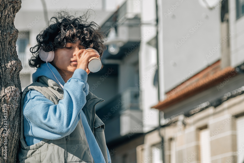 young Latin Hispanic man wearing headphones and drinking a takeaway