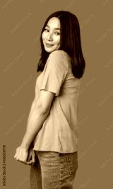 Young woman in orange shirt smiling against bright green background during casual indoor setting