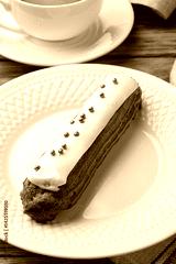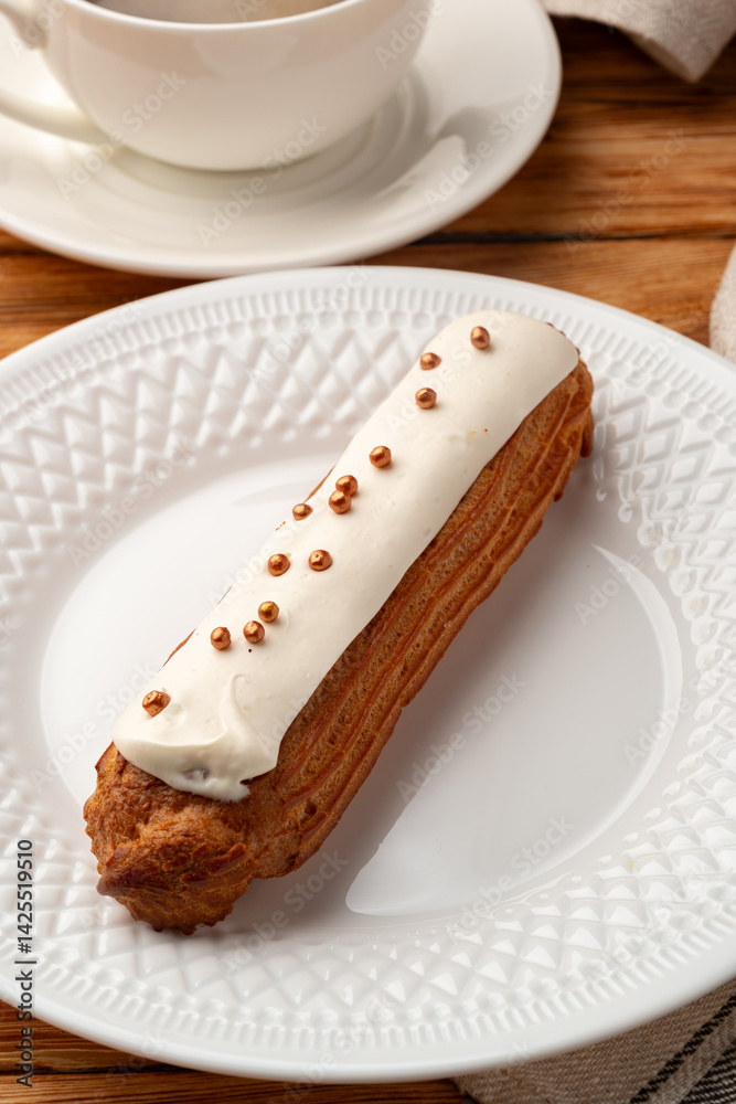 Delicious eclair topped with creamy frosting and golden sprinkles on a decorative plate