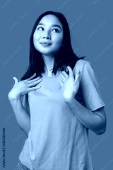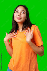 Young woman poses confidently in bright orange shirt against vibrant green background