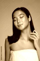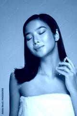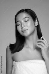 Woman enjoying a fragrance in front of a vibrant pink background while wrapped in a towel at a beauty studio