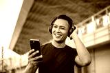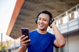 Asian man in blue t shirt is wearing headphones listening to music while looking at his smartphone.