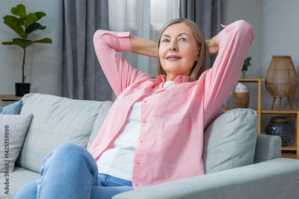 Smiling mid aged woman in pink shirt looking contented while spending time at home