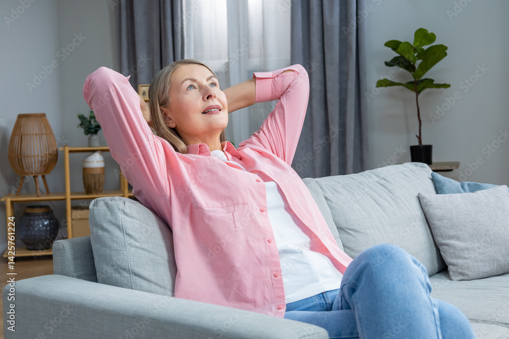 Smiling mid aged woman in pink shirt looking contented while spending time at home
