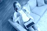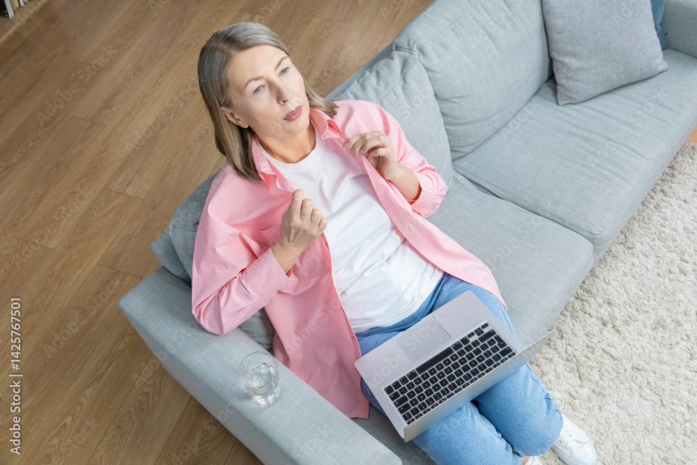 Mid aged woman in pink shirt feeling unwell and having a headache