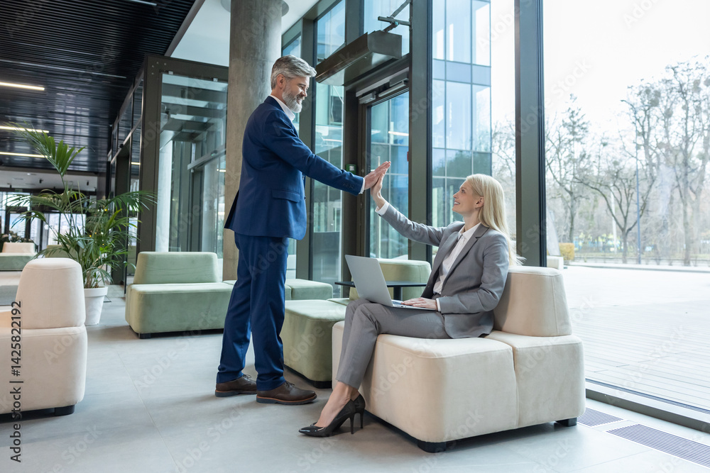 Entrepreneur and coworker in office discussing online business contract giving high five
