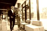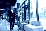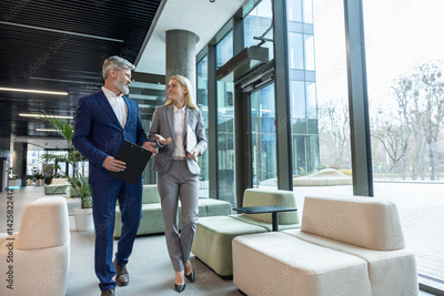 Businesswoman and businessman walking in office talking about corporate partnership and teamwork