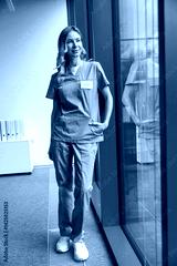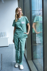 Blonde doctor therapist standing near window in medical clinic