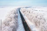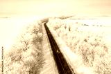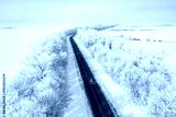 An asphalt road runs in the distance among snow-covered trees on a frosty winter day.