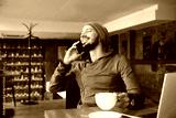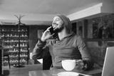 Young handsome hipster man with beard sitting in cafe talking mobile phone, holding cup of coffee and smiling. Laptop on wooden table.