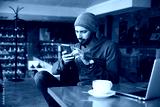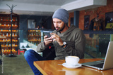 Young handsome hipster man with beard sitting in cafe talking mobile phone, holding cup of coffee and smiling. Laptop on wooden table.