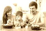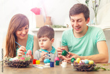 Mother, father and son are painting eggs. Happy family are preparing for Easter.