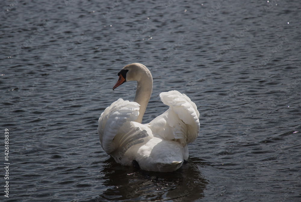 22.04.2025 Białystok Polska. Wiosenny czas i piękny biały łabędź w całej okazałości.