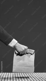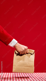 Hand in red suit holding kraft paper bag over red checkered table against vivid red background. Concept of food, emotions, pop art photography, takeaway, delivery services. Vertical layout