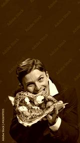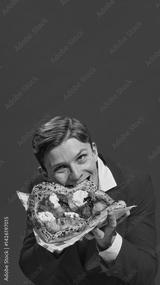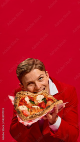 Excited young man biting pizza with mischievous smile against solid red background. Food satisfaction. Concept of food, emotions, pop art photography, appetite, fun, restaurant content