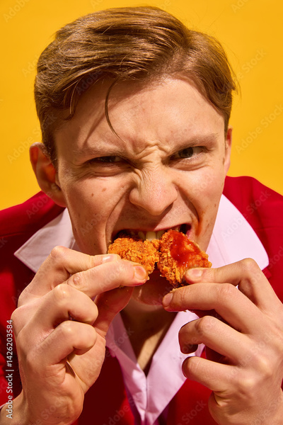 Close-up portrait of handsome young man fiercely biting two chicken pieces with sauce against bold yellow background. Concept of fast food aesthetics, pop art photography, emotions
