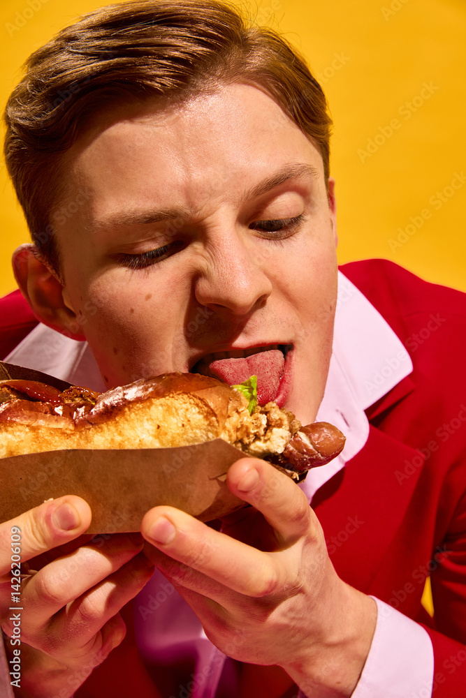 Close-up portrait of young man licking tip of hot dog with exaggerated expression and playful hunger against bright yellow background. Concept of fast food aesthetics, pop art photography, emotions