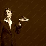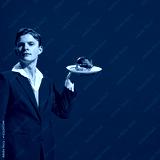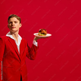 Handsome and serious young man in red suit and white shirt proudly holding plate with chicken burger against cold red background. Concept of fast food aesthetics, pop art photography, emotions