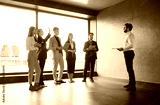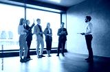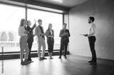 Business team talking during meeting in empty office conference room, brainstorming in co-working space with large panoramic window, project leader talking to colleagues, choosing best candidate