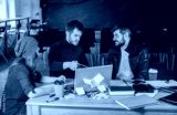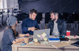 Young smart team discussing project on meeting in the office. Working environment with laptop, coffee, notepads and stationery.