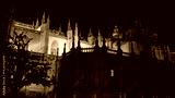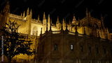 Seville Cathedral displaying intricate gothic architecture at night in Spain - SEVILLE, SPAIN - MARCH 25, 2025