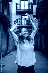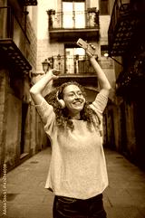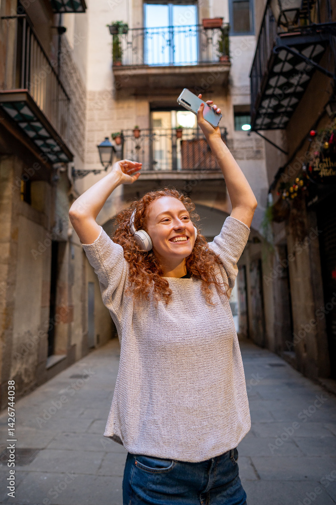 Young redhead woman dancing in a narrow street listening to music with headphones and holding smartphone