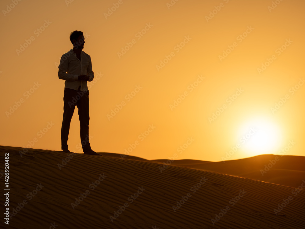 Young handsome man stands on the sand dune in the desert and looking far away during sunset. Young man in stylish clothes stands alone on top oh the sand dune in the desert at sunset.