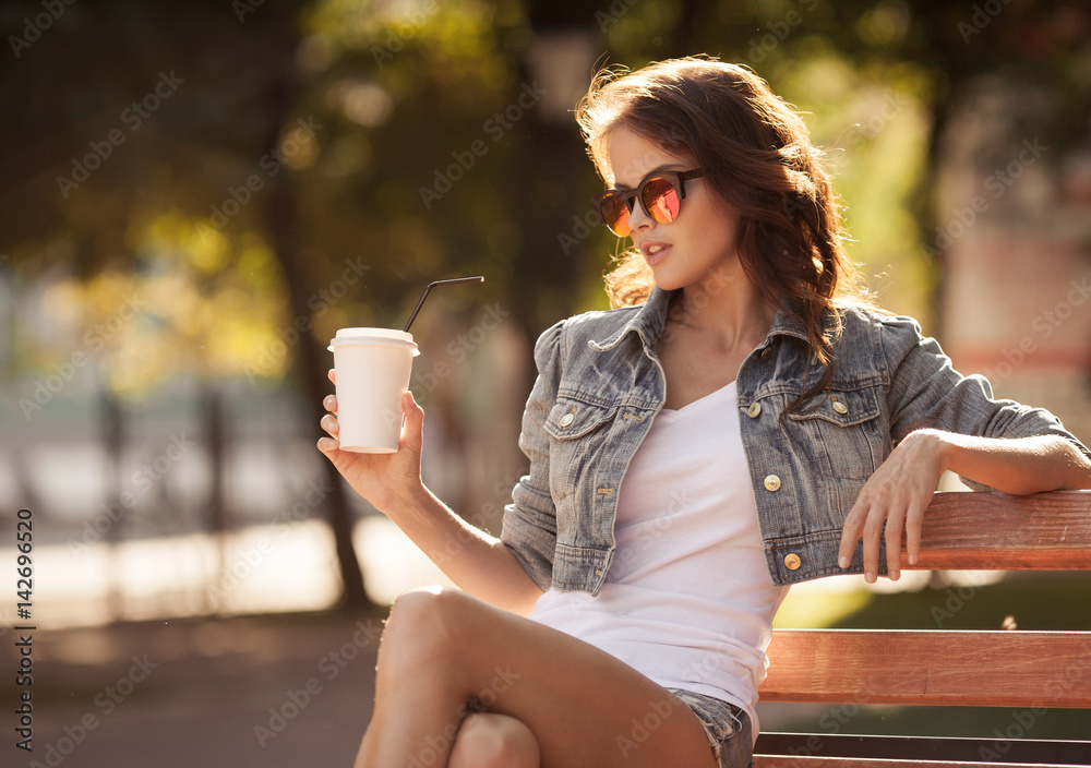 Young woman drinking coffee from paper cup. Sitting on bench in park.