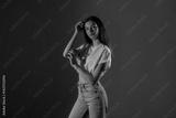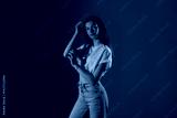 Model poses creatively under colorful lighting in a studio setting during a fashion photoshoot