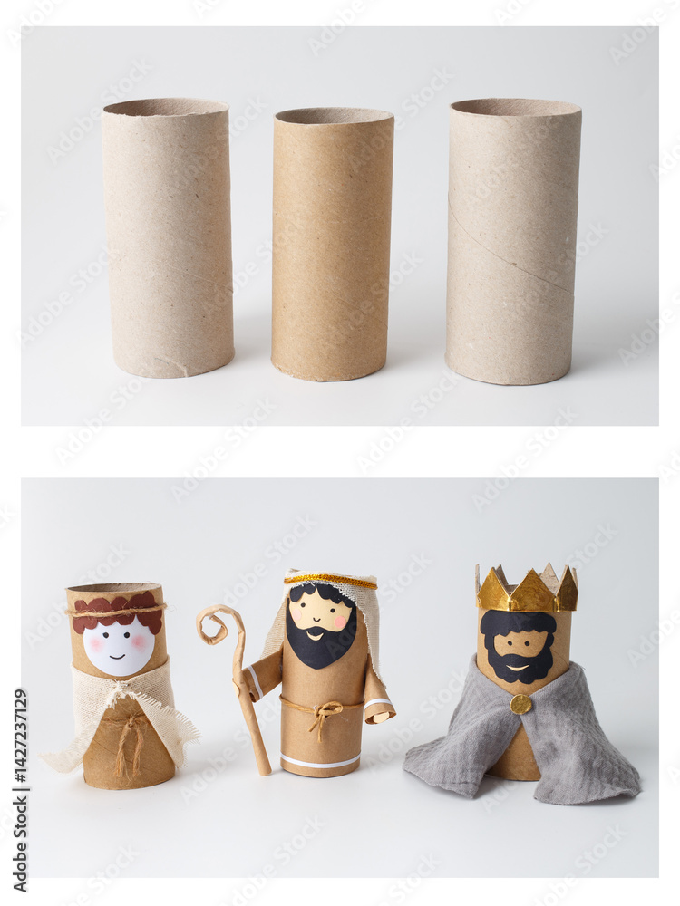 Step-by-step cardboard roll craft showcasing progress from basic material to figurines, ideal for DIY planners, eco-friendly brands, holiday decor businesses, or classroom activities
