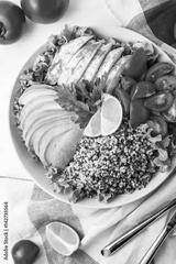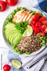 Healthy salad bowl with quinoa, tomatoes, chicken, avocado, lime and mixed greens (lettuce, parsley) on white wooden background top view. Food and health.