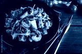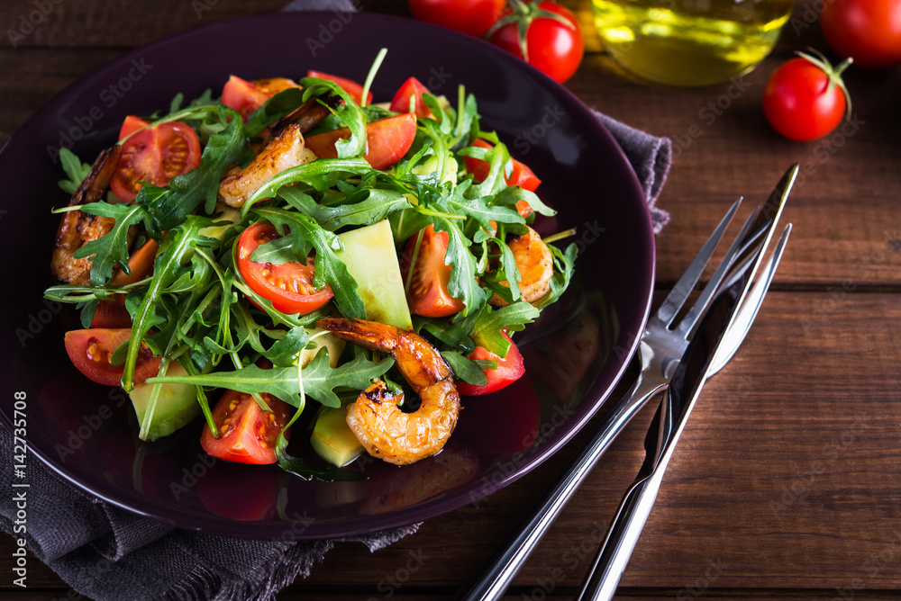 Fresh salad plate with shrimp, tomato, avocado and arugula (salad rocket) on wooden background close up. Healthy food. Clean eating.