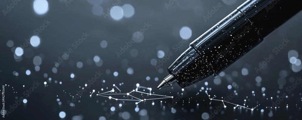 A pen creating constellations on a sparkling surface, symbolizing creativity and inspiration.