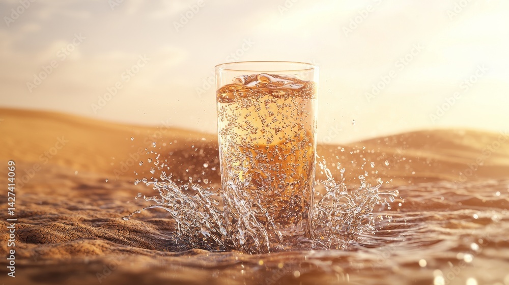 A refreshing glass of water splashes in a sunlit desert backdrop, symbolizing hydration.