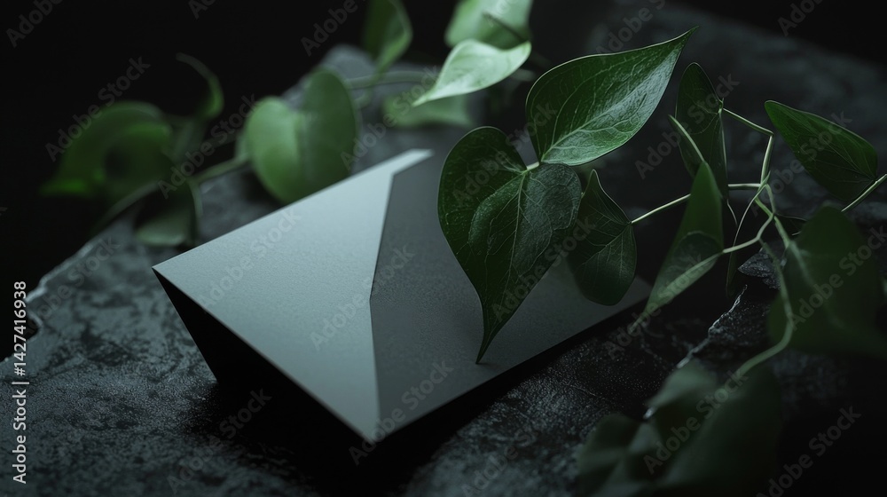 A sleek geometric shape surrounded by lush green leaves in a dimly lit setting.