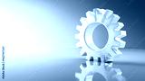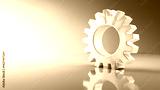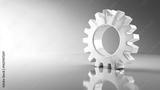 A sleek white gear on a reflective surface, symbolizing precision and design.
