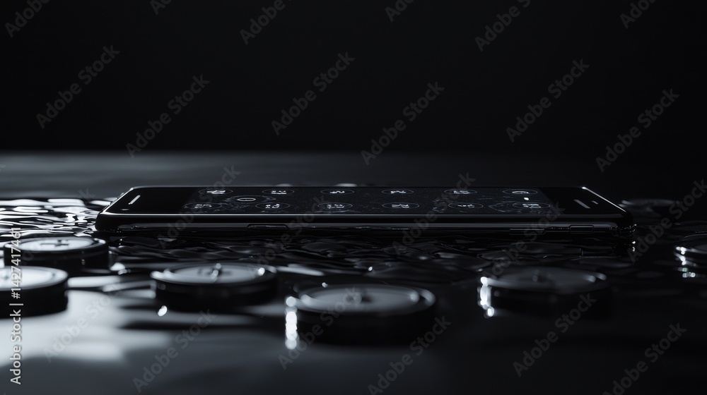 A smartphone lies on a dark surface surrounded by coins, symbolizing finance.