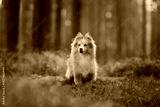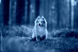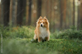 A Collie sitting gracefully in a sunlit forest clearing surrounded by tall trees. The serene scene highlights the dog's elegant posture and connection to nature.