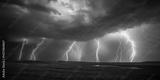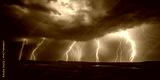 Dramatic lightning storm over a field with dark clouds and bright strikes illuminating the landscape