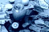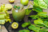 Detox diet. Green smoothie with fruits and vegetables on wooden dark background