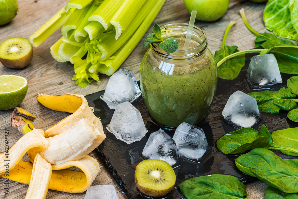 Detox diet. Green smoothie with fruits and vegetables on wooden dark background