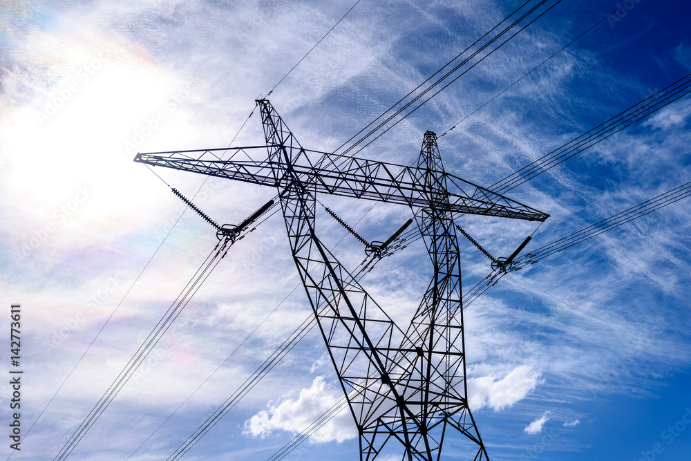 High voltage power transmission tower on blue sky background, electricity distribution.